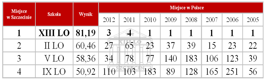 Miejsca czterech najlepszych szczecińskich liceów w rankingu „RZECZPOSPOLITEJ” i „PERSPEKTYW” 2012: